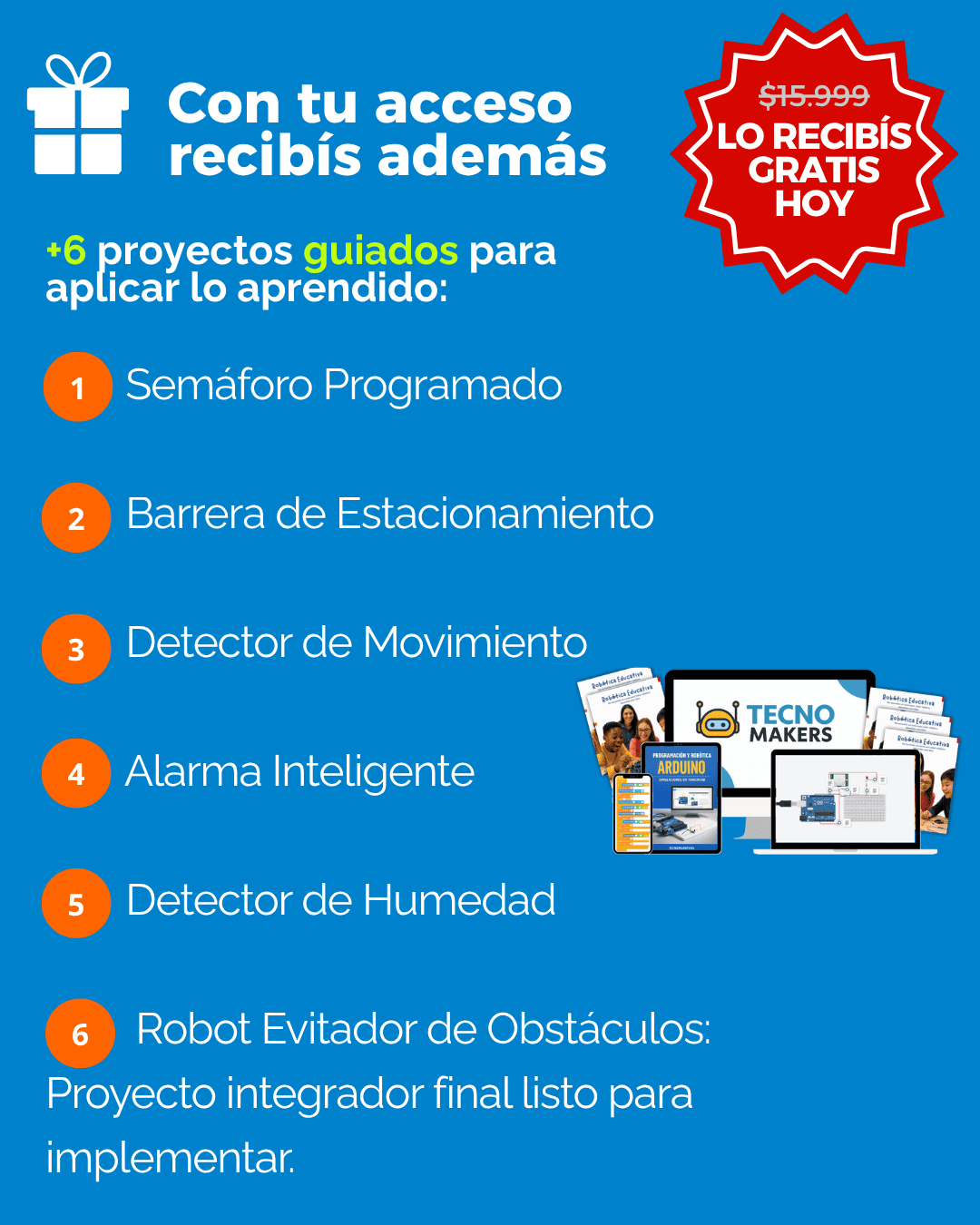 Además, accedés a proyectos extra en los bonos, como el robot evitador de obstáculos, para seguir avanzando con tus alumnos.